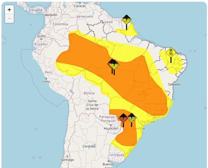 De acordo com dados do Centro Virtual para Avisos de Eventos Meteorológicos Severos para o Sul da América do Sul (Alert-AS/Inmet), a região está classificada em Perigo Potencial (amarelo) e Perigo (laranja) para chuvas intensas.